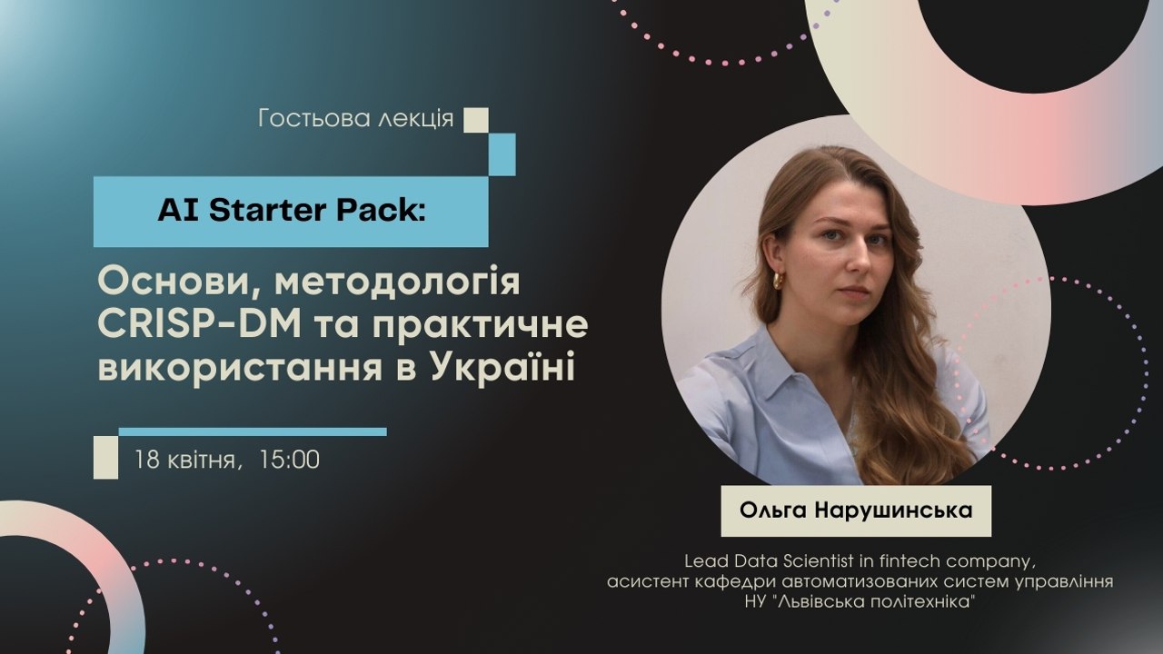 Запрошуємо всіх охочих 18 квітня о 15:00 на гостьову лекцію "AI Starter Pack: Основи, методологія CRISP-DM та практичне використання в Україні" від Ольги Нарушинської, Lead Data Scientist, асистентки кафедри автоматизованих систем управлiння НУ "Львiвська полiтехнiка".